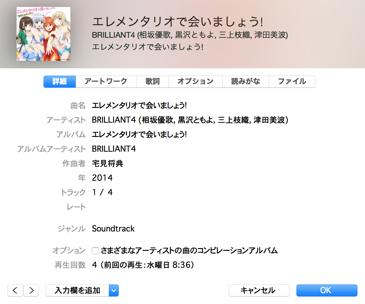 1200×1200というサイズだと、データサイズが気になるかもしれませんが、高々300KB程度ですので、まぁ気にしない。この方法の最大のメリットは、デフォルトで追加されるアートワーク(600×600程度)より高精細なアートワークが追加できること。iPhone 6 Plus等、画面サイズの大きなプレイヤーではなるべく高精細なほうが嬉しいですからね。デメリットはアートワークのサイズが大きいことと手間がかかること。標準サイズだとデータサイズは100KB程度ですが、1200×1200だと3倍くらいになります。