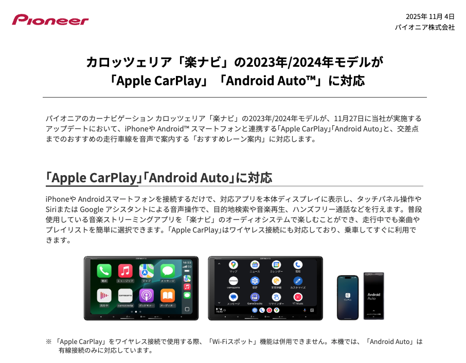 対象は、2023年モデル、2024年モデル。店頭で2025年モデル(x22系)を確認しましたが、こちらは既にAndroid Auto、CarPlayに対応していたので、要するにソフトウエアの仕様を揃える意図があるように感じます。
