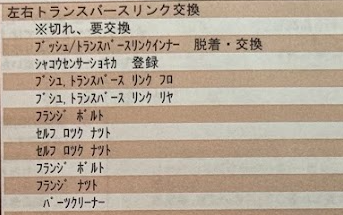 今回の車検では、トランスバースリンク、フロントスタビライザーリンクの交換を行いました。いずれも走行距離の増加、経年劣化で交換が必要になるパーツです。