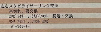 次に、車検に向けて準備した内容です。車検時の見積もりに入っていたり、それ以前の整備の段階で指摘されていて、DIYで修理調整した内容など。