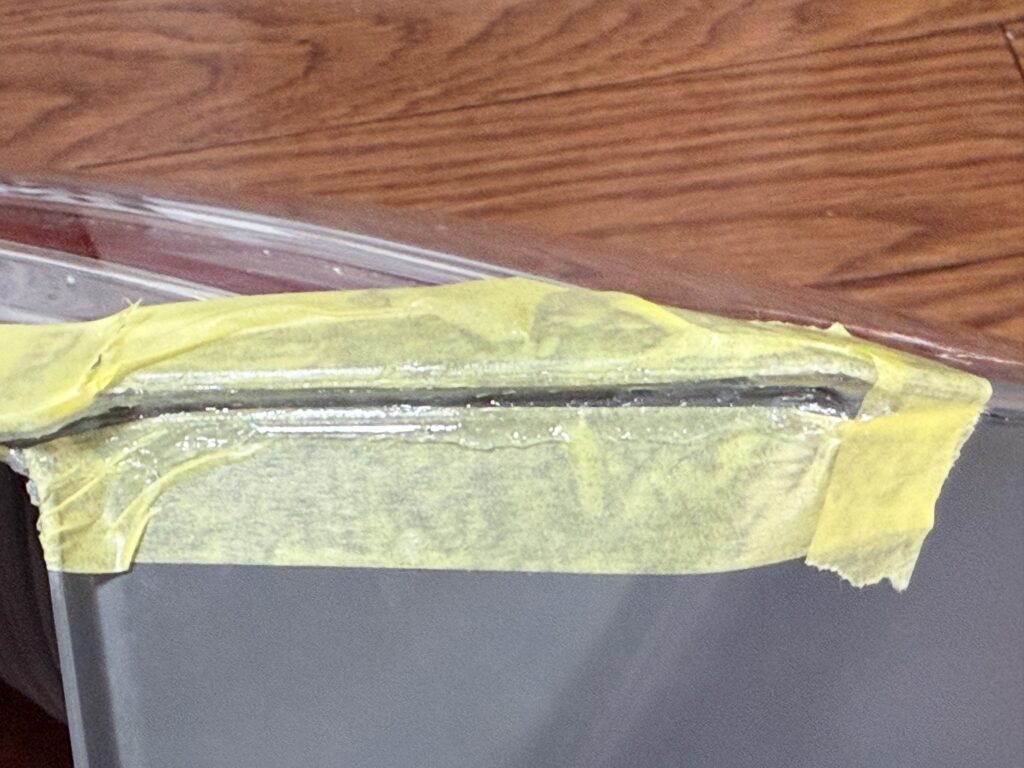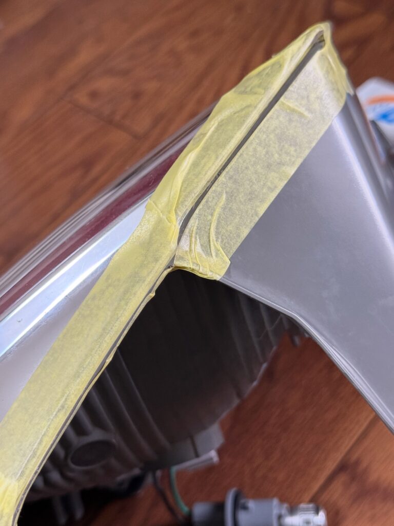 コーキング剤は不要なところに付いてしまうと落とすのが大変なのでしっかりマスキングしました。狙うのは、コンビレンズのクリア部品と本体の隙間です。