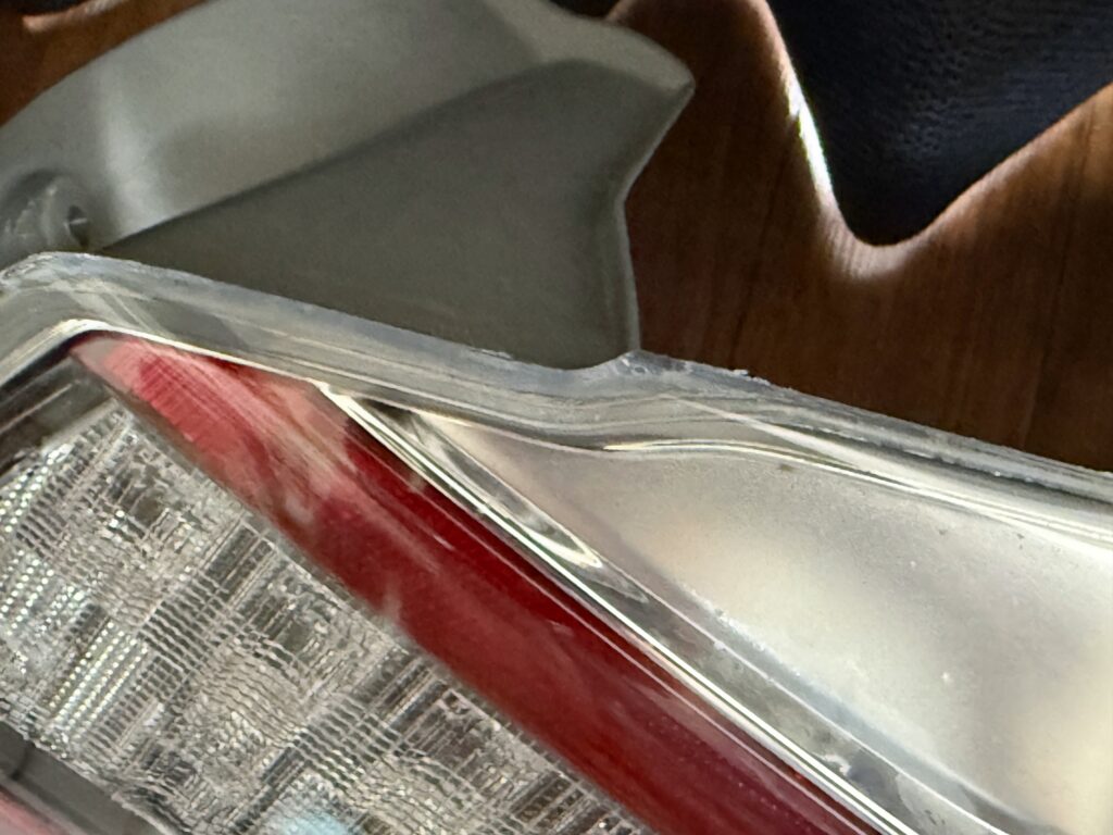 事象自体は2024年の12月頃から確認していました。レンズの中が曇ったり、水滴が付いたりするので、適宜外して乾かしたりしていたのですが、一向に収まる気配はありません。よく見たら、コンビレンズ上部のカーブしている部分のシールに隙間が出来て、水が流れ込んでいることが分かりました。これも、この形状のGP系のリアコンビレンズでは結構見られる事象ですね。