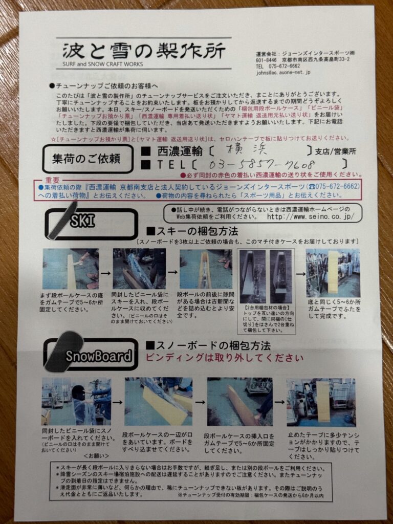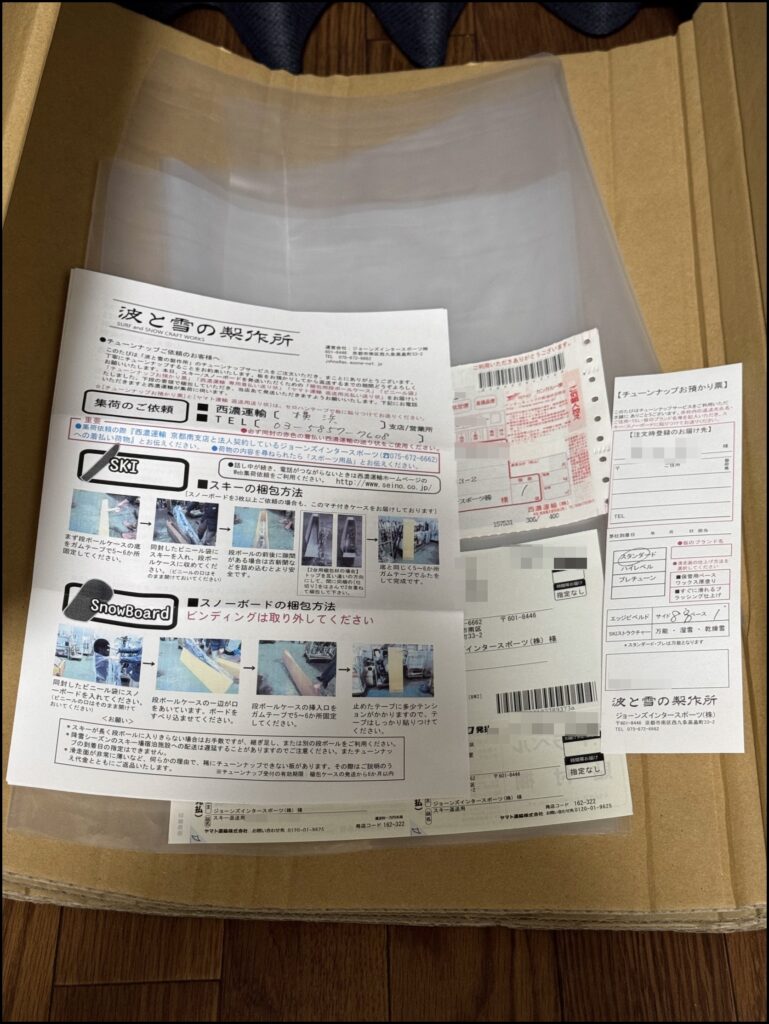 中身はこんな感じで、説明書と往復の伝票、スキー板に貼り付ける作業依頼表、そして板を入れるためのビニール袋まで一式が届きます。