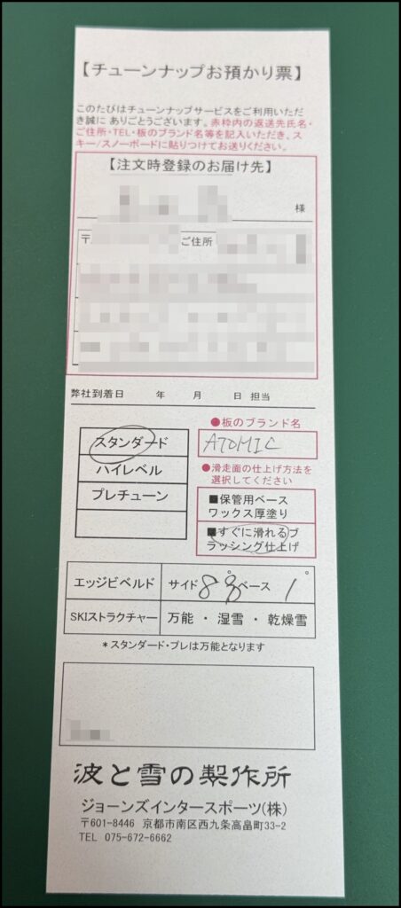 作業依頼表に必要事項を記載して、これを板に貼り付けて発送します。返信用の伝票も一緒に貼り付けて送ります。今回はシーズンイン直前ということで、すぐに滑れるコースを選んでいます。