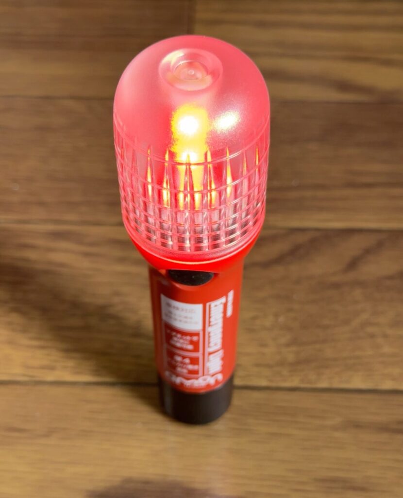点灯試験してみました。スイッチを押すと点滅し、もう一度押すと消えます。それだけのシンプル機構です。発煙筒の代わりになるものなので、思ったよりも明るい印象でした。ボタン周りも電池の蓋もちゃんと防水されています。