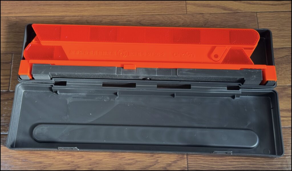 ケースを開くと三角表示板が畳まれて収まっています。重いのは足場がしっかりしているためです。軽量を謳う製品もありますが、設置時の安定性を考えると多少重量はあったほうが良いかなと思うところです。