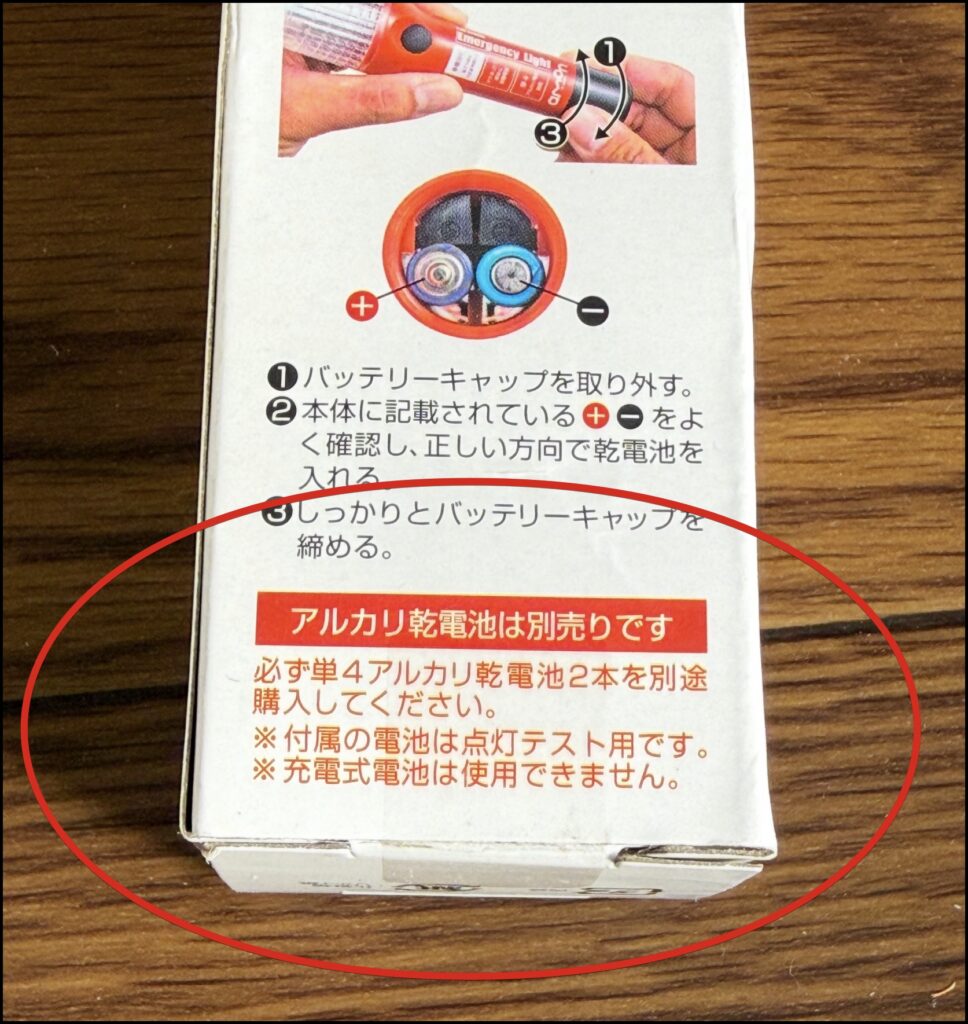 基本的に付属の電池は「点灯テスト用」という位置づけです。理由はあくまでこの製品は新品のアルカリ電池を入れた状態を動作条件として、連続点灯時間などを謳っているので、付属電池がどれほどの性能を維持した状態でユーザーの手元に届くかは保証の範囲外ということですね。