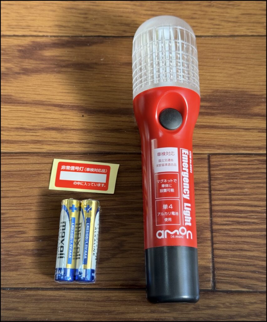 続いては非常信号灯です。発煙筒は期限もあるし、燃焼時間もそんなに長くないので、LED式がほしいなと思っていました。このエーモン製非常信号灯はメーカーでの採用実績もあるようなので、安心して購入できます。