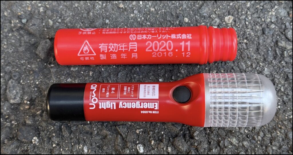 しばらく前から買わねばと思っていた三角停止板と非常信号灯をAmazonプライムデーのタイミングで購入して車に積みました。三角停止板は高速道路での停止時は設置しないと違反になるし、非常信号灯は積んでないと車検に通らない一方で、発煙筒には有効期限もあり、せっかくだからどちらもちゃんとしたものを積んでおきたいところです。