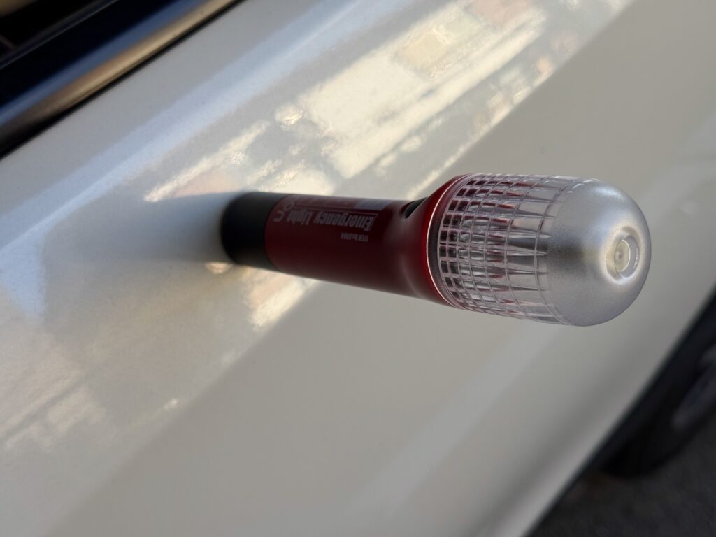 ちゃんと助手席足元の、発煙筒ホルダーに収めることができました。これで安心です。シンプルに発煙筒よりも信頼性が高いLED非常信号灯は結構有益だなと思いました。