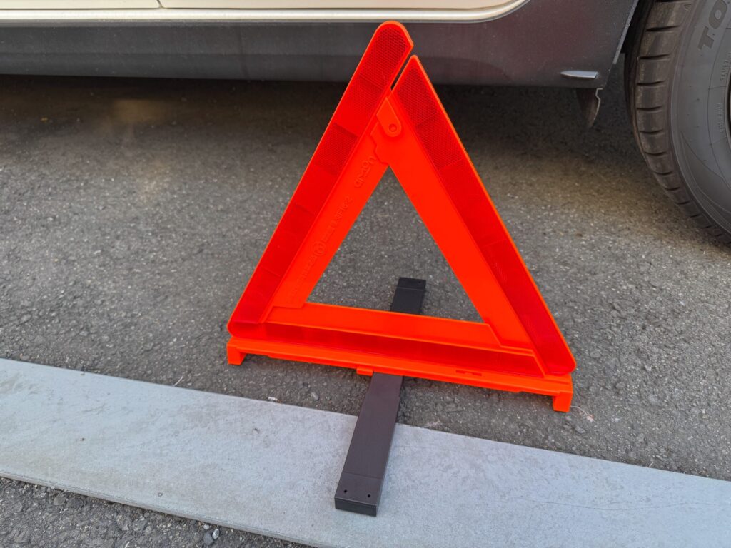 特に三角停止板は高速道路で使うことが想定されており、通過する車両の走行風圧で倒れてしまっては元も子もないので、こういうスタンダードなデザインが良いんだよな、と実物を見て改めて思いました。