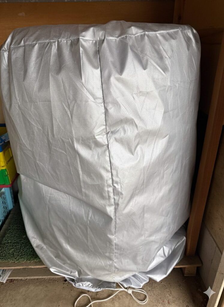 上から一般的なタイヤカバーをかけて完成。こちらはしっかりと遮光性もある素材で、安心感があります。流石にちょっと高いですけど、この2重構成は安心感が高くて良いです。