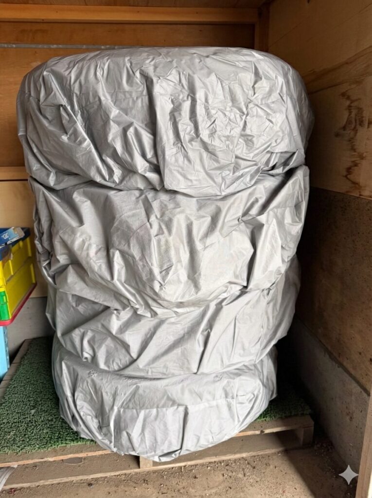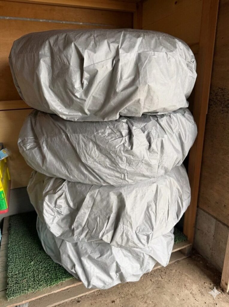 さらに1個づつダイソーのタイヤカバーで覆ってあります。この構成が現状ベストかなと考えており、比較的保管状態は悪くないかなと思います。