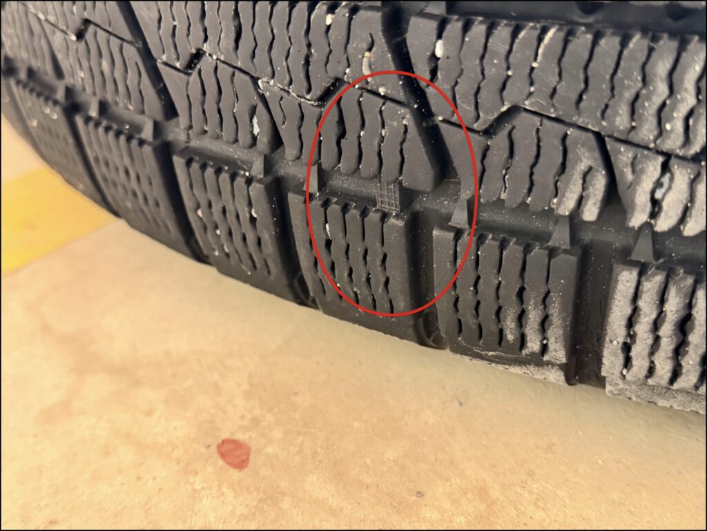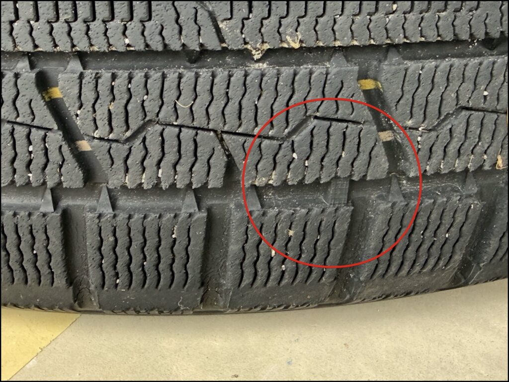 実際まだ走れるのか?というところでポイントとなるのがプラットフォーム。タイヤ側面矢印のところにプラットフォームという溝の盛り上がりがあって、ここまで摩耗すると冬タイヤとしての性能がもう無いよ、という基準になっています。このプラットフォーム、トレッド面の内側と外側とに交互にあるのですが、特に摩耗が激しいのは内側です。こちらは前輪装着分ですが、かなりプラットフォーム近くまで摩耗しているのが分かります。