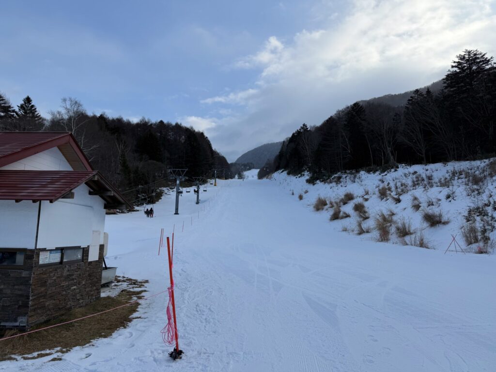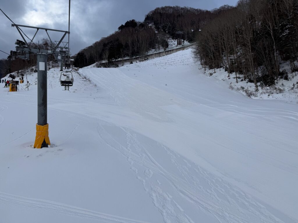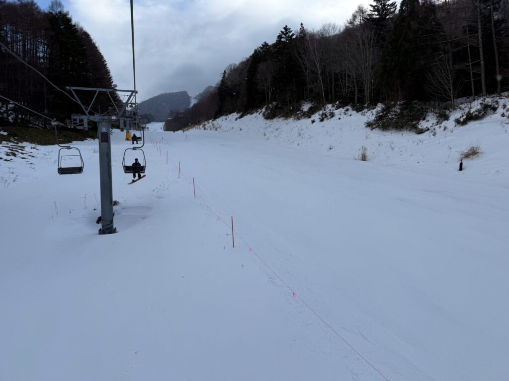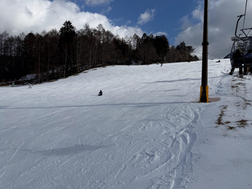 下部、イエローコース。1回しか滑りませんでしたが、前回よりアイスバーンは状況緩和されていたようにも感じます。降雪が進んだのかもしれません。それでもリフト下など見ると雪が薄いのが分かります。