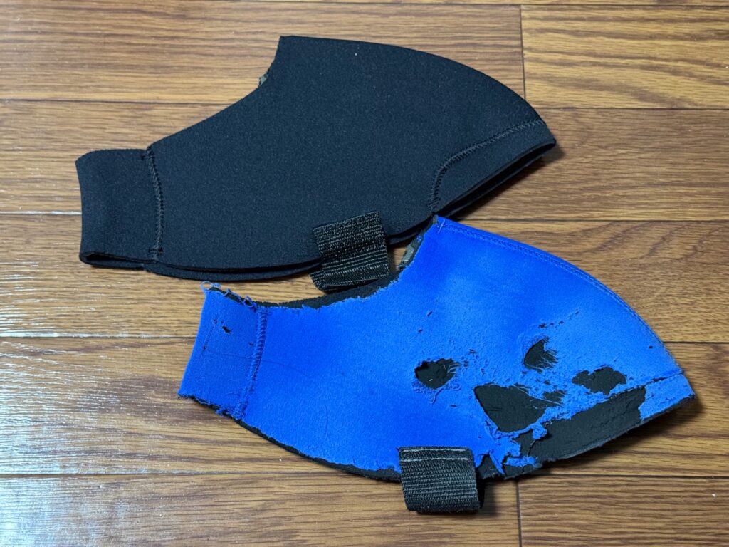 新旧比較。端がほつれてくるのは、ここに雪が付着して凍ってしまうためです。