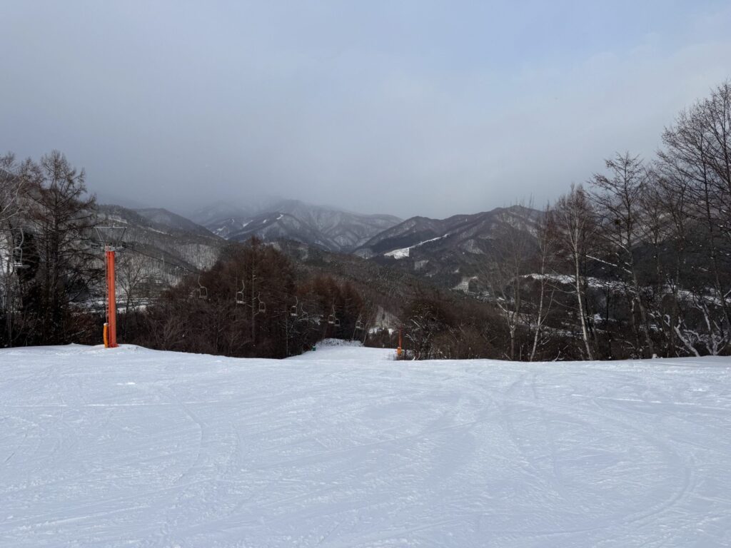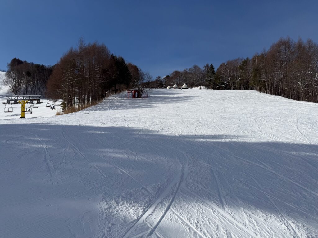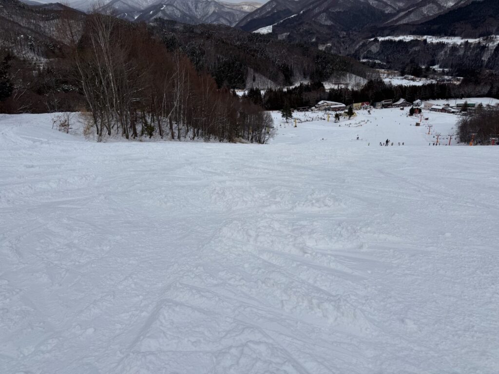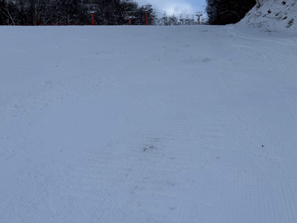 ゲレンデは年明けの降雪で新雪です。新雪が圧雪された非常に滑りやすい雪質でした。ただ、絶対的な積雪がやっぱり少なかったです。なので、朝イチの印象としては「要注意」だと感じました。
