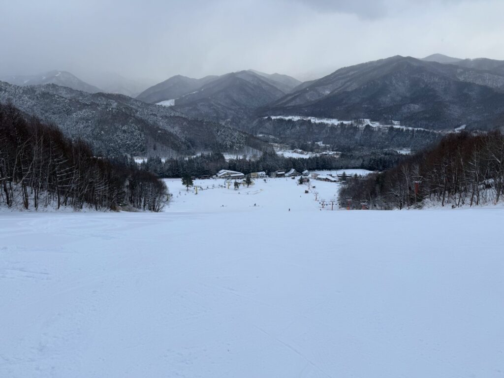 朝イチの駐車場からの景色。雪雲がうっすらとかかっていて、雪が降る天気です。気温は-3℃程度。寒すぎない程度の絶妙な気候でした。駐車場も混雑しておらず、いつもの落ち着いたかたしな高原スキー場かなという雰囲気でした。