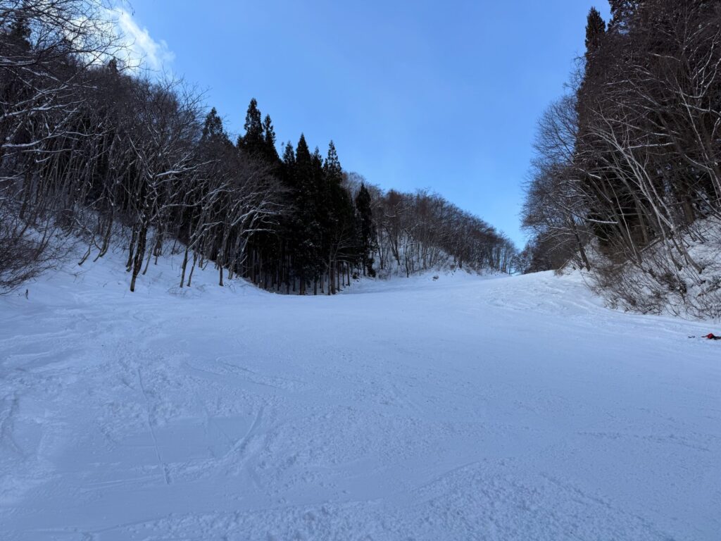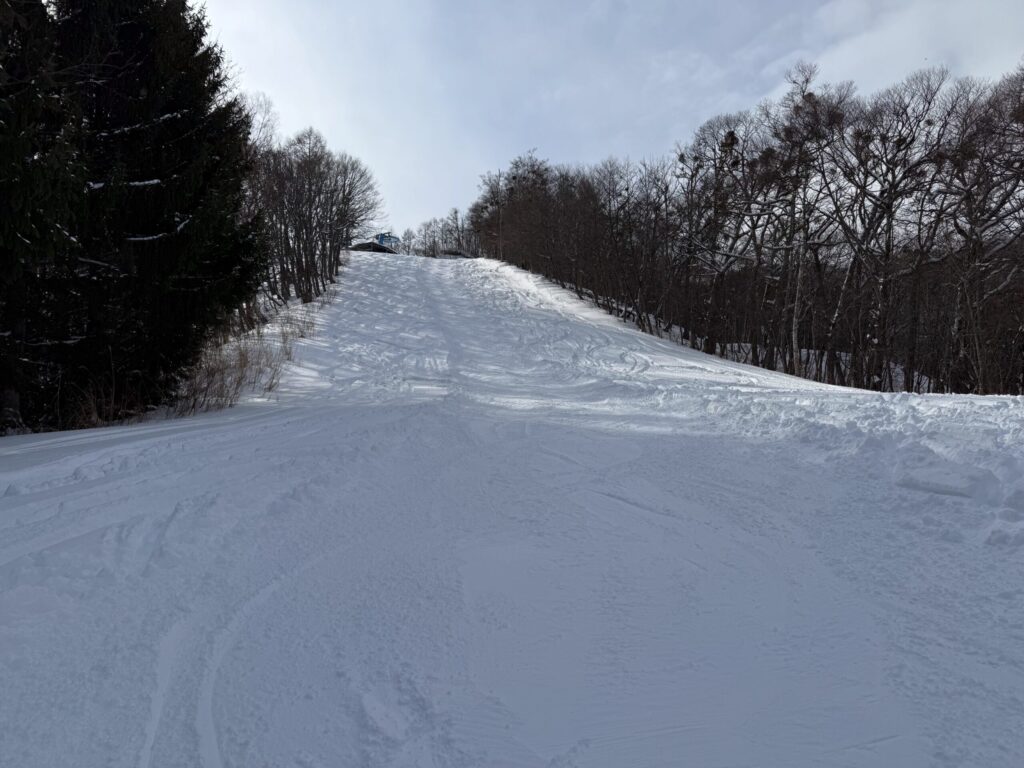 こちらはちぐさコース。ここ細いんですよね。ちょっと人が集まると窮屈で滑りにくい感じがします。思ったより雪が積もっていて滑りやすい印象でした。