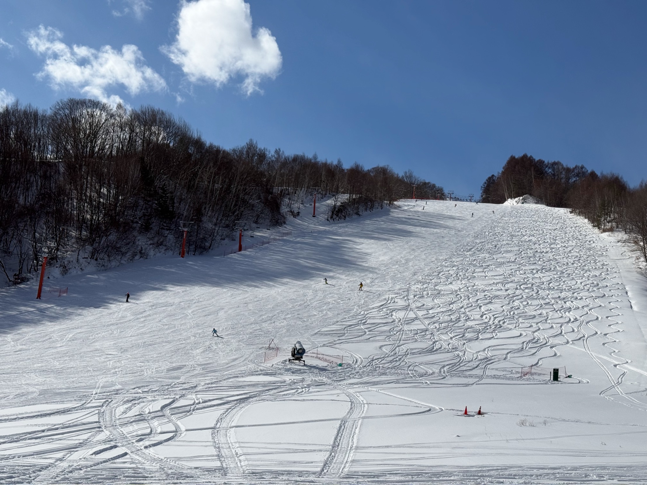 日が照ってきたかえでコースです。こうして見ると非圧雪範囲は半分くらいあったのかもしれません。