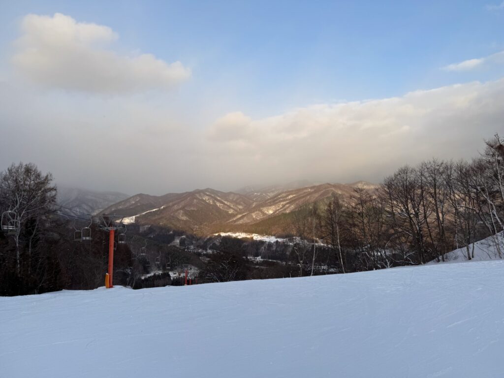 青いリフトで山頂へ。ここから見える緩斜面ですが、ここも非常に雪質が良くて滑りやすかったです。練習には最適だったのではと思います。