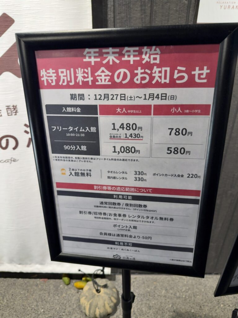 なぜ白寿の湯は混んでいないか?というと、設備のキャパシティが比較的大きいことと、食事や休憩を取っている人が多く、お風呂があまり混雑していないこと、そして比較的料金が安くないことがあります。なので、なんとなく、混んでる時期に使うようにしています。