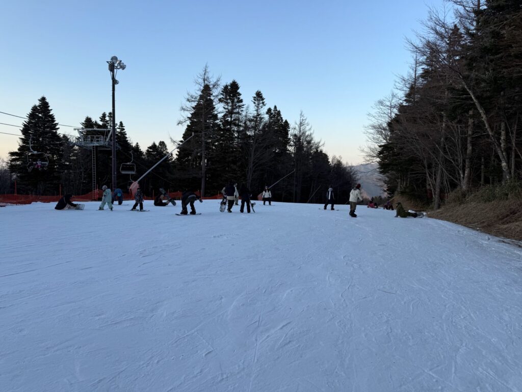 準備をしてゲレンデに向かいました。この日は天気も良かったので、特に防寒は意識せず普通の格好でゲレンデに向かいました。ただ、夜になったら寒くなったので、もう1枚羽織ったほうが良かったかなとあとで後悔しました。