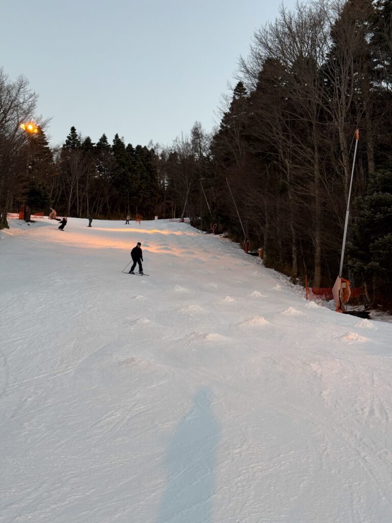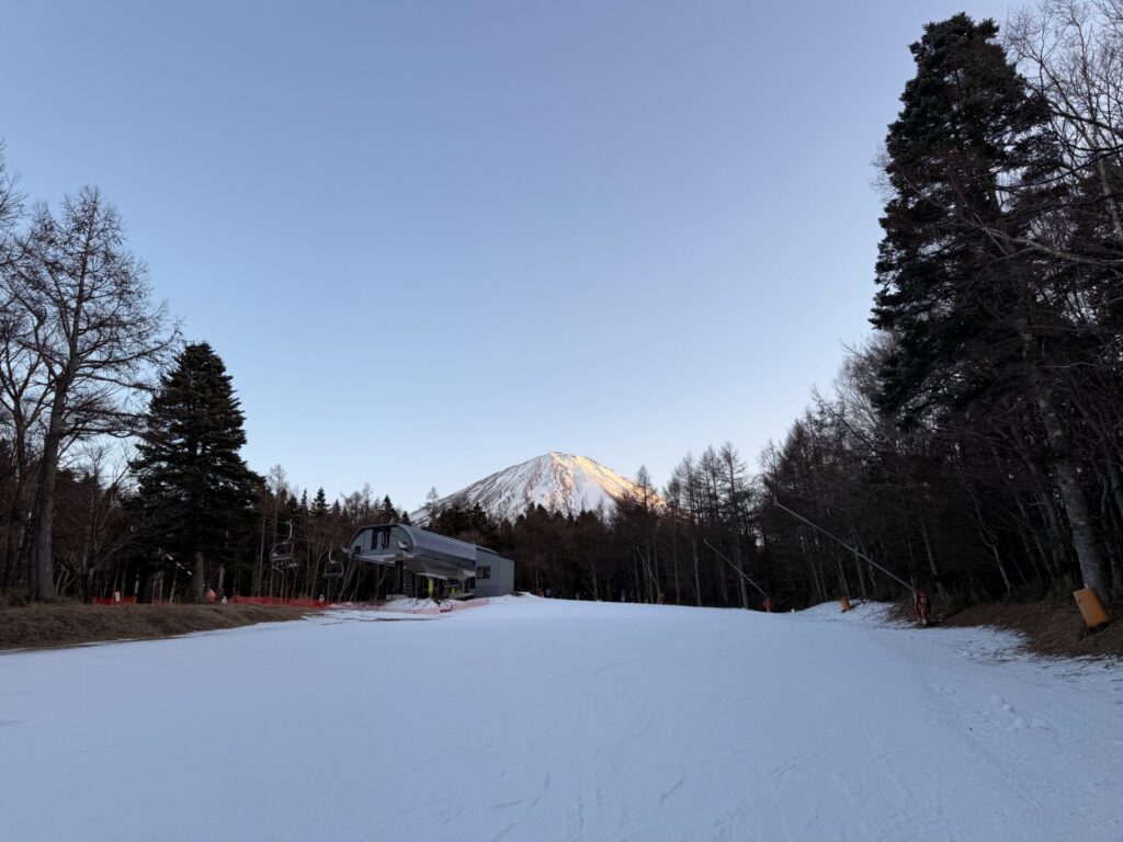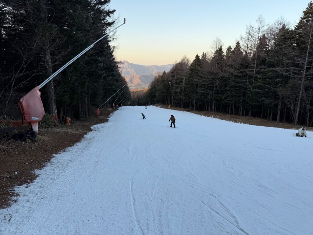 ゲレンデは人工雪、かなり固めでした。積雪量もちょっと減って、薄い箇所もあったかなと感じました。とはいえ石や土が出ているところはなく、ゲレンデの安定感はさすがふじてんだなと思いました。