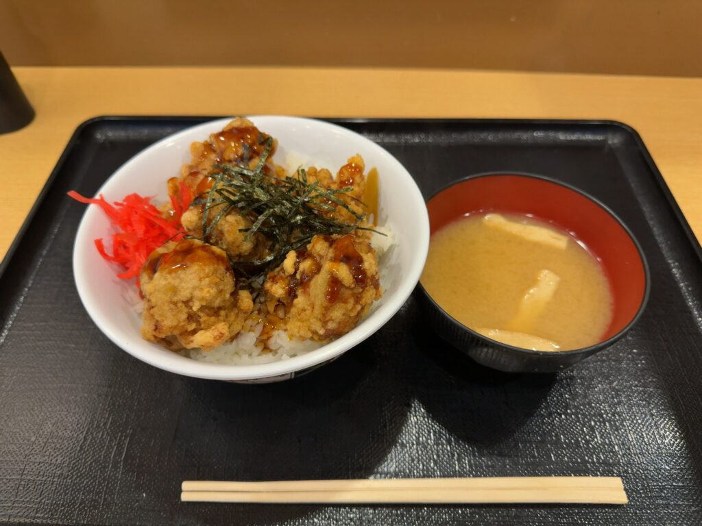 何にしようかちょっと悩んだのですが、当初から食べたいと思っていた唐揚げ丼にしました。これを食べるために昼食を軽めにしたところもあり。唐揚げがジューシーで熱々で美味しかったです。