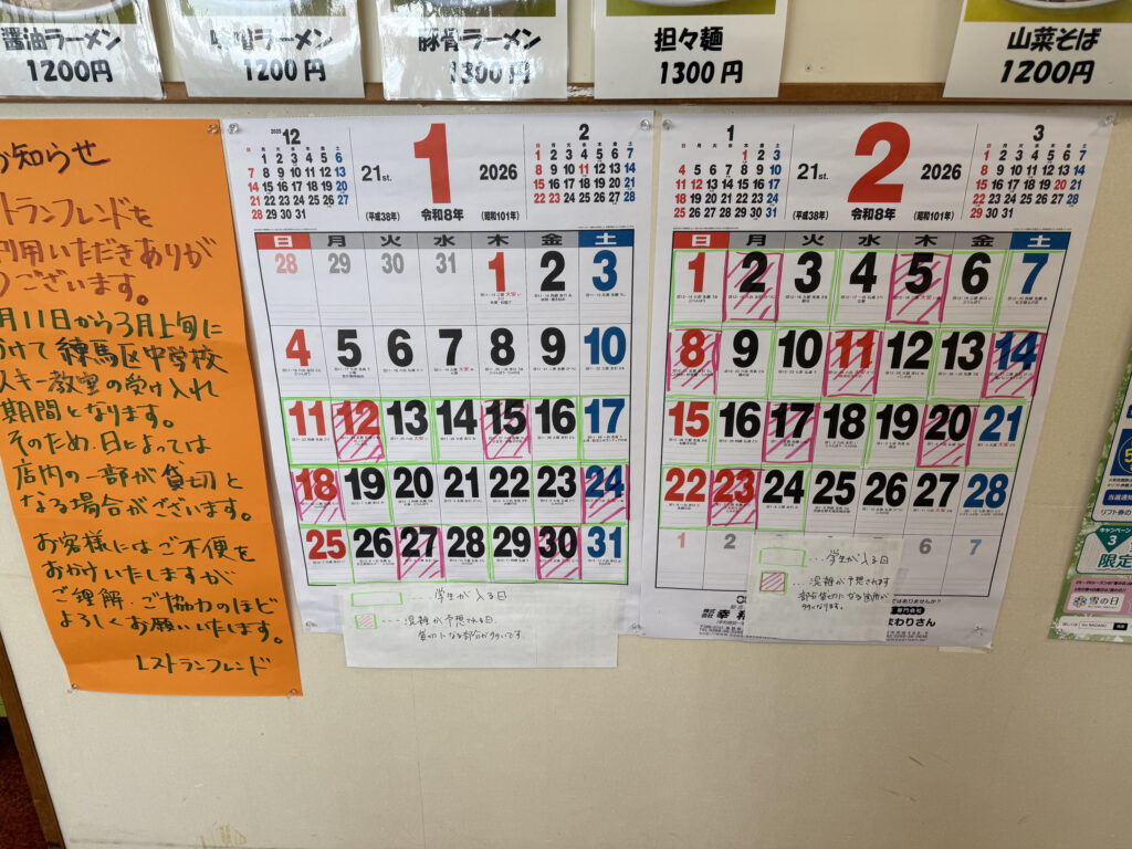 レストハウス「フレンド」に団体受入状況や混雑具合のカレンダーがありました。これは有益な情報です。この日、1月30日は、混雑が予想される日にマークされてました。