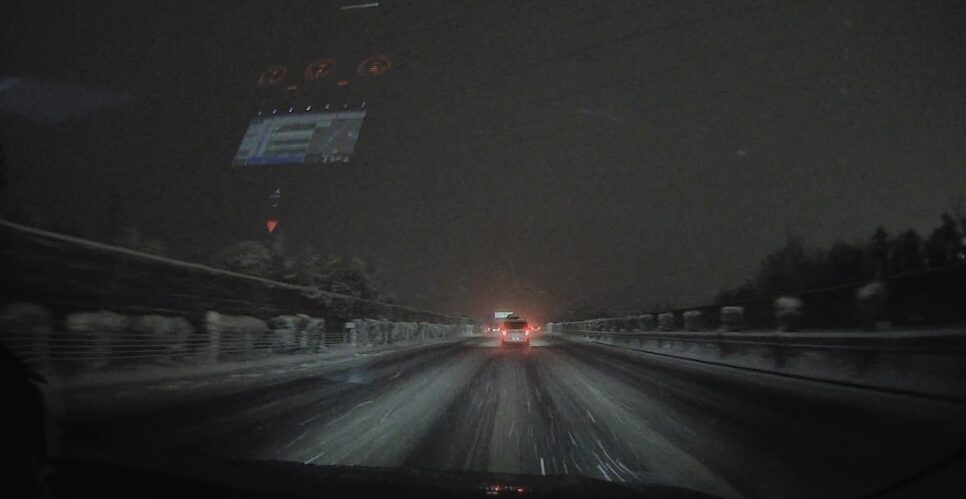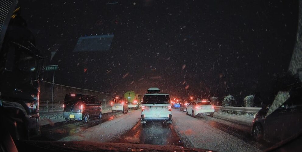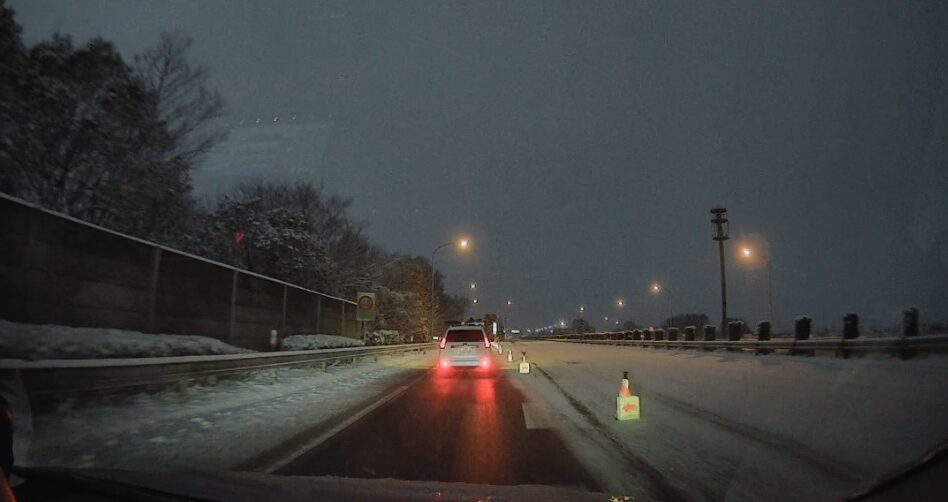 そして上里手前、3kmほどの渋滞です。この時はまだ事故渋滞だと思っていたのですが、なんとまさかの全車上里SA流入規制が行われていました。路面は完全な雪道です。