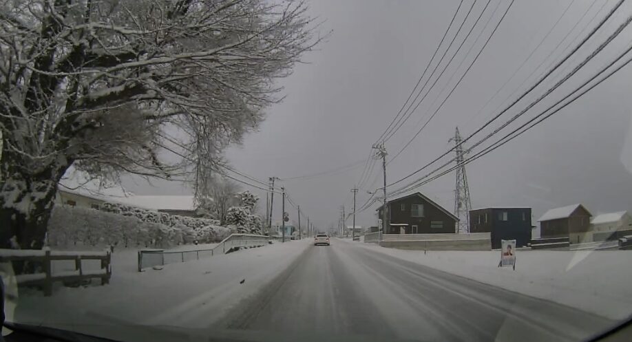 嵐山付近から怪しくなってきました。路面にも雪が積もりつつあります。