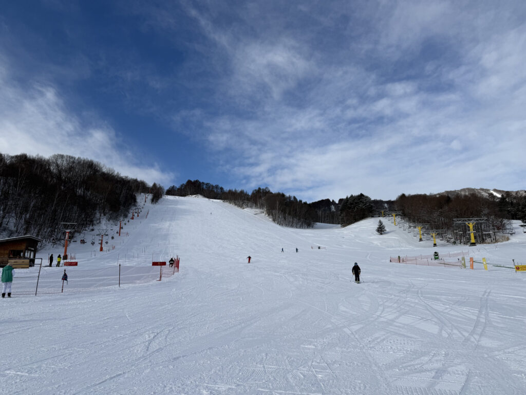 これがかたしな高原スキー場、朝の様子です。寒波の道中とは大違いで、気持ちの良い青空です。気温も低く、雪質もかなり良かったです。