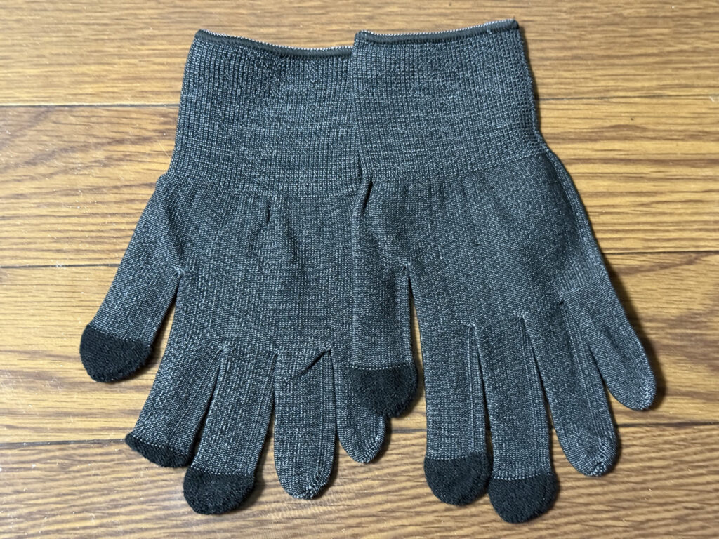 インナーグローブとして汗を吸収してくれるところなどは期待通りで、特にグローブと重ねて付けた時に圧迫感やきつい感じもなくて良いです。スムス手袋だと汗などの水分を過剰に吸収してしまい、指先に寒さを感じるようなシチュエーションもあったのですが、この手袋はそれがありません。素材が綿じゃなく化繊なのがポイントだと思います。