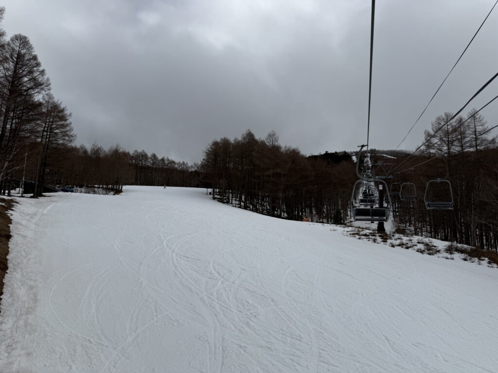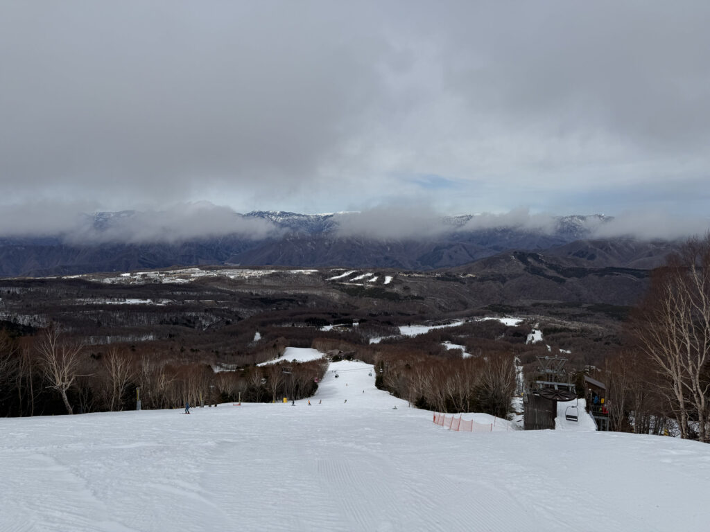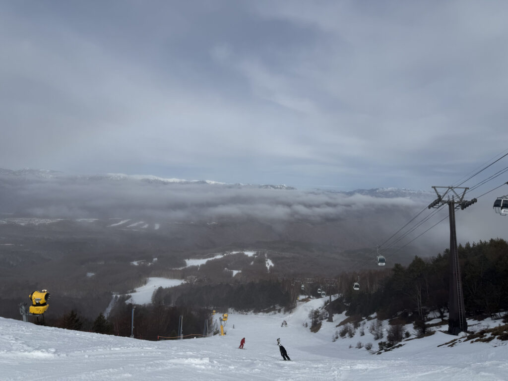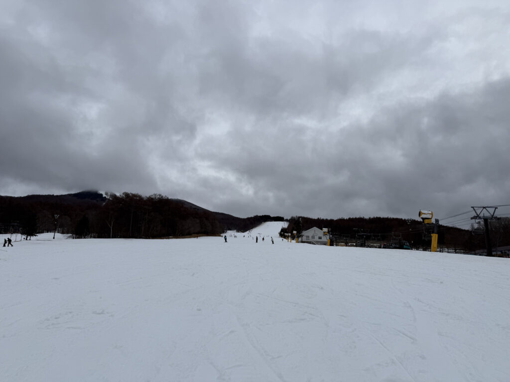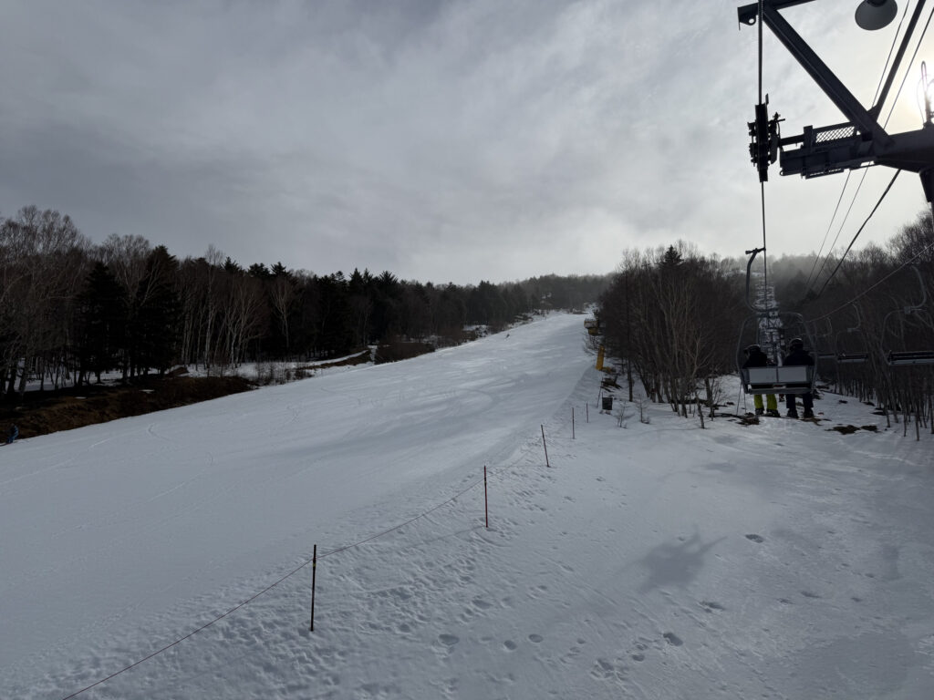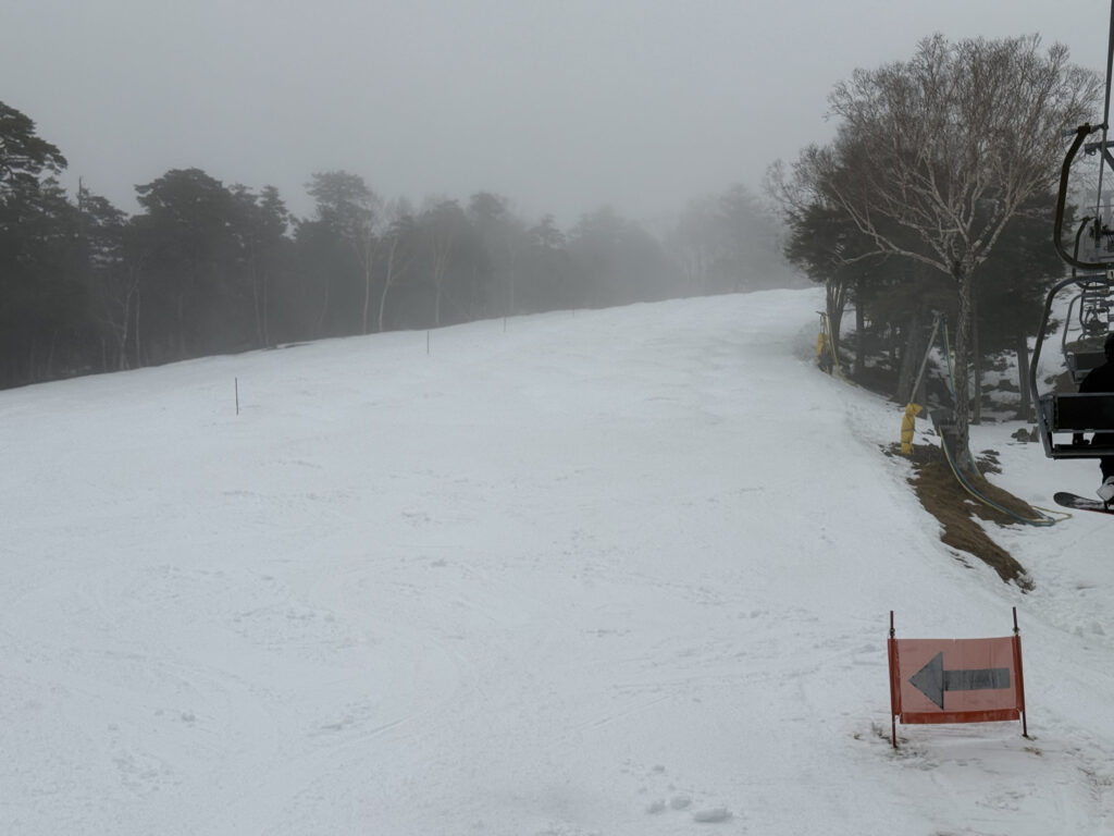 準備をしてゲレンデに向かいました。天気は曇です。朝は霧雨がちらついていました。日中も時折山頂が雲に覆われる時間があって、日差しはほぼ無かったです。お陰でゲレンデはよく滑るシャバ雪でした。
