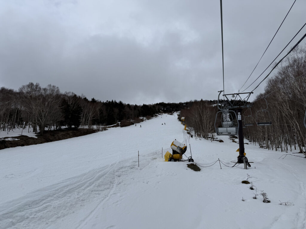 2月末、春の陽気のハンタマでしたが、しっかりとゲレンデに雪が残っていたのが印象的でした。これは人工雪をしっかりと積み上げているからこその安定感だと思います。自然雪頼みのスキー場だとこうは行かなよなと思いました。