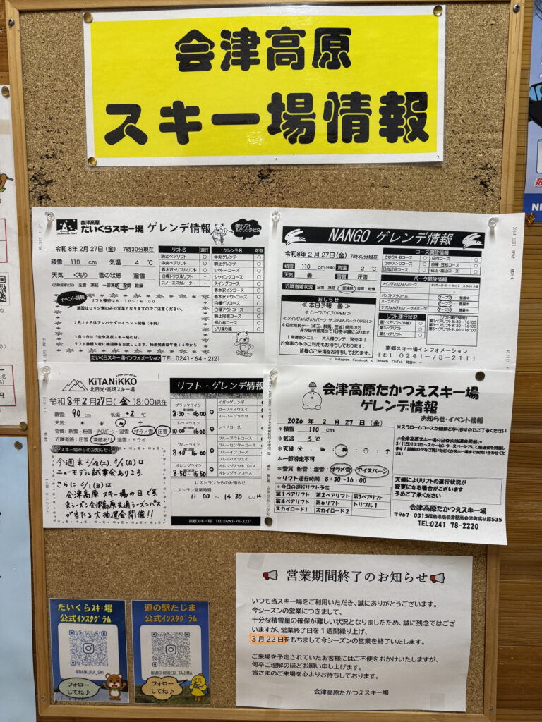 2026年2月27日、金曜日です。前週末からの春の陽気でスキー場の雪解けが進んでしまい、ここから先、どこに滑りに行くか、選択が厳しい時期に入ってきます。もともとこの週末は、南信方面に滑りに行くつもりだったのですが、どうにもコンディションが怪しいので、福島方面に変更です。シーズン初の南会津ツアーに行くことにしました。