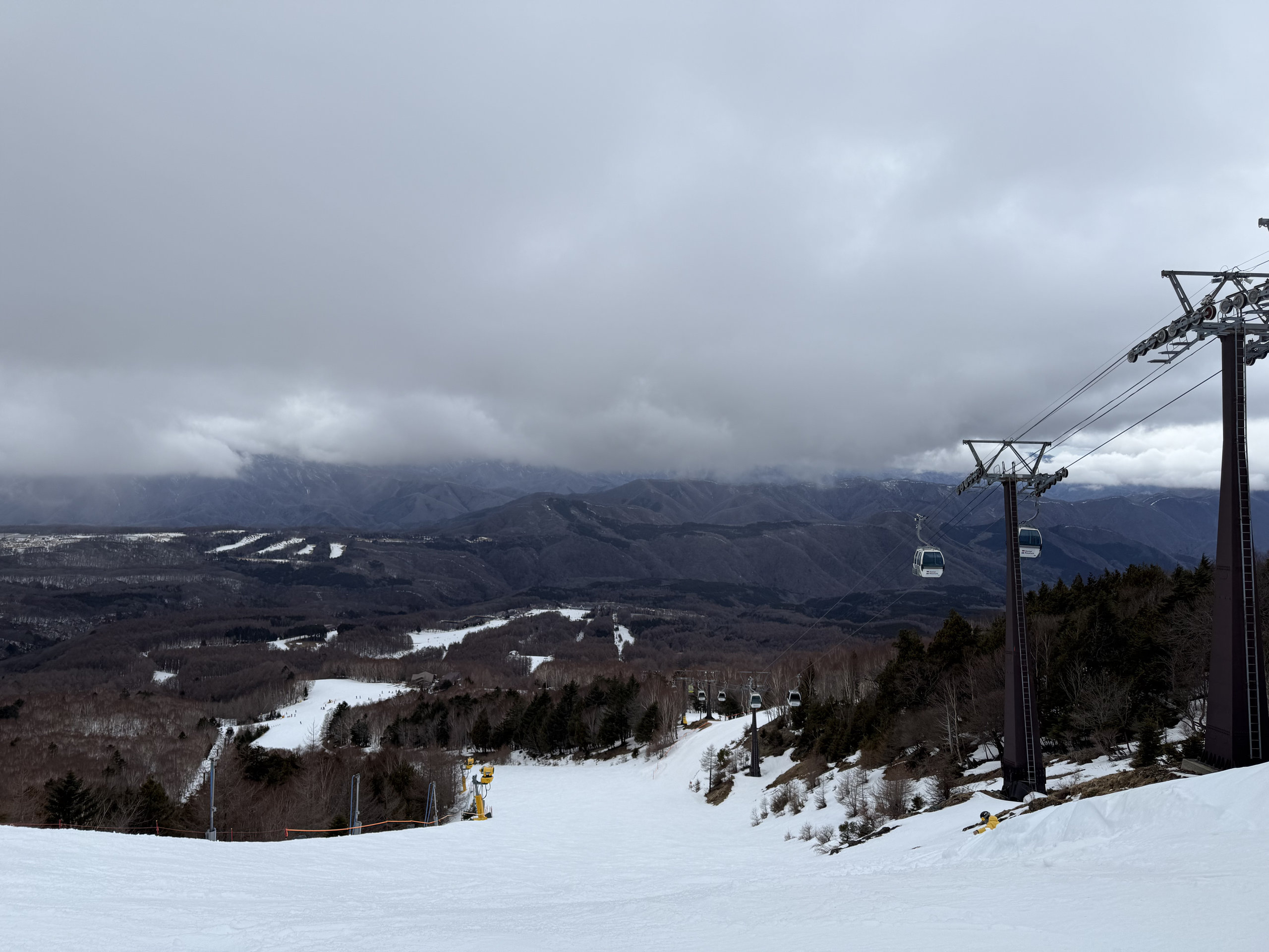 準備をしてゲレンデに向かいました。天気は曇です。朝は霧雨がちらついていました。日中も時折山頂が雲に覆われる時間があって、日差しはほぼ無かったです。お陰でゲレンデはよく滑るシャバ雪でした。