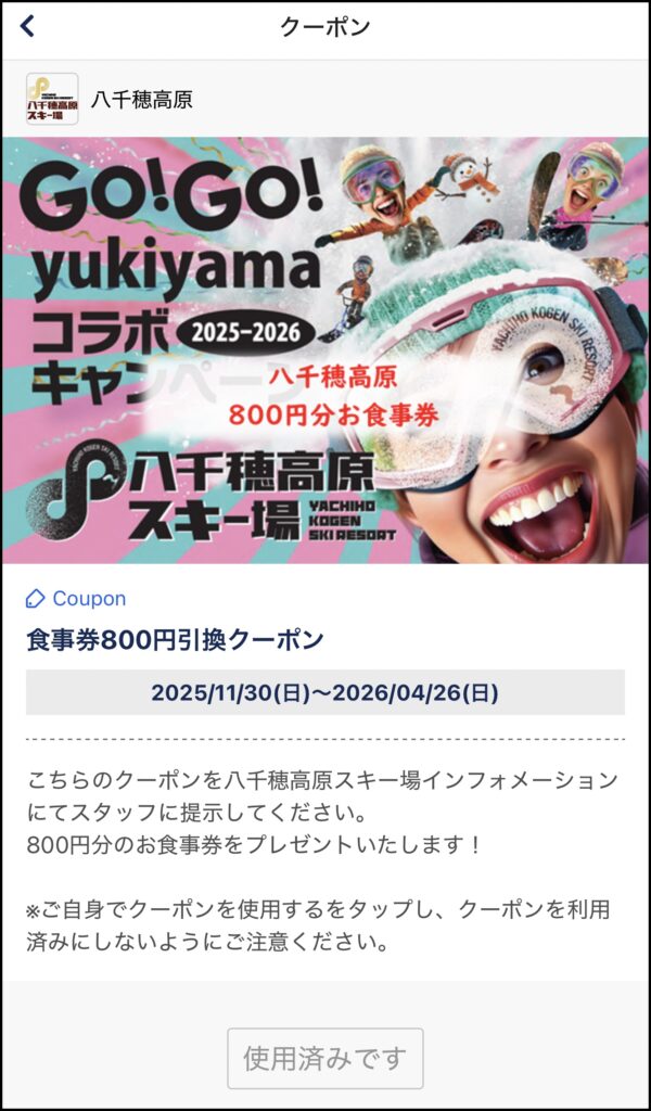 そして「当たり」といえば、今回はハイエイトチョコも当たったし、食事券ももらえたし、持ってて良かったyukiyamaアプリ、って感じでした。チェックインするだけでいろいろ応募できたりする企画もあるので、滑走記録アプリとしてオススメです。
