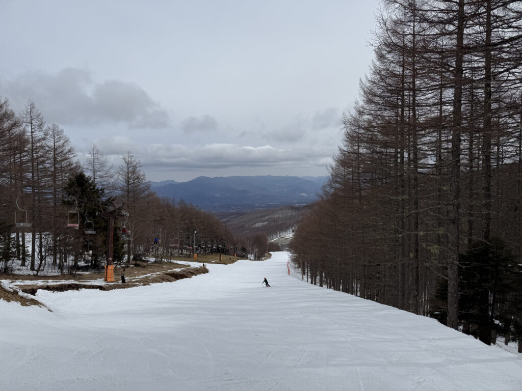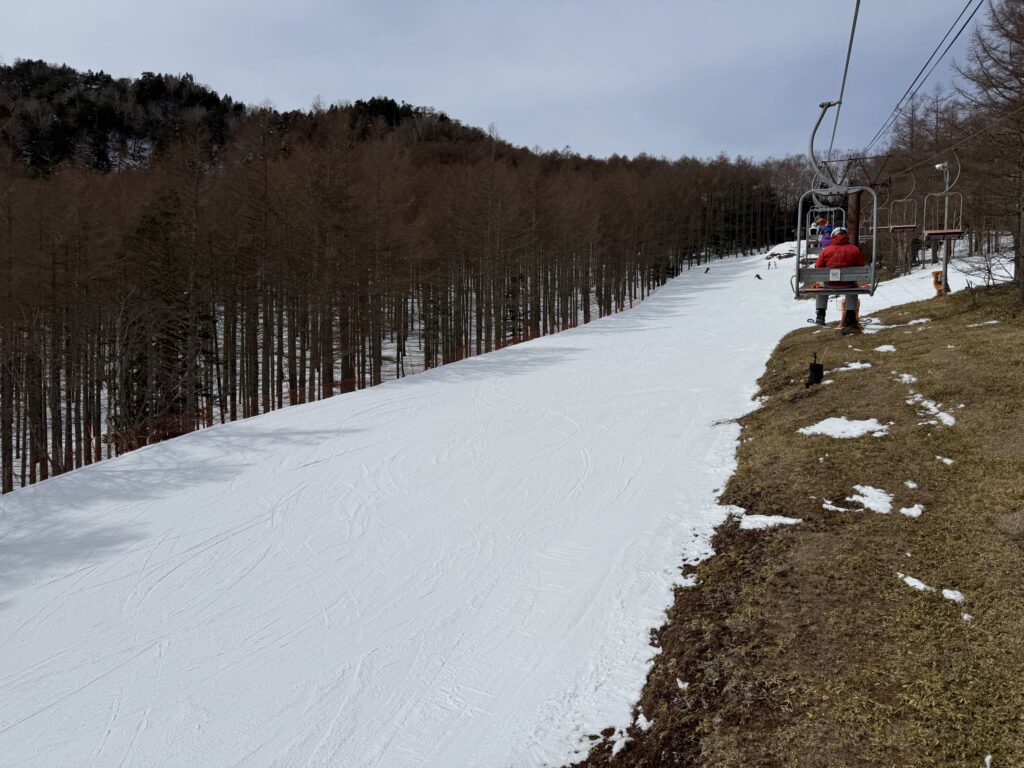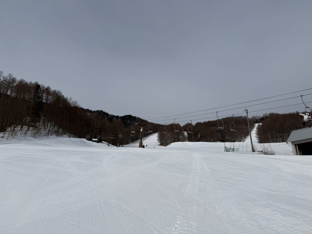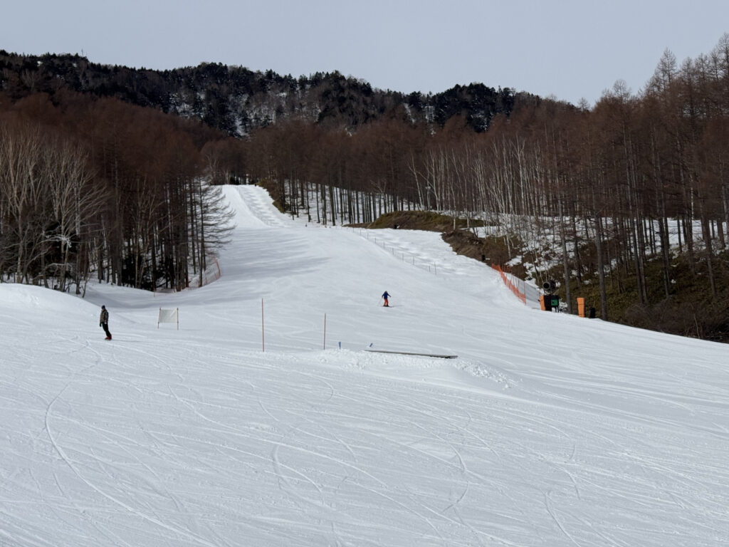 ゲレンデはしっかり整備された人工雪。気温さえ下がれば降雪できちゃう八千穂高原スキー場の本領発揮といった感じで、この時期とは思えない良好なコンディションでした。