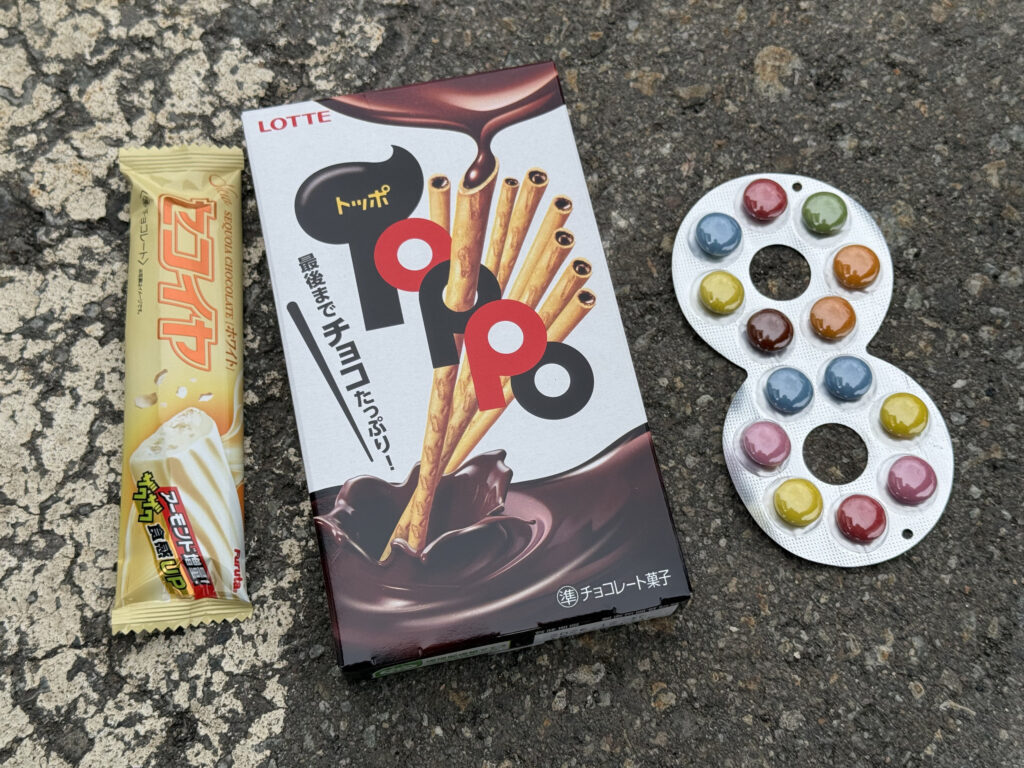 第一回休憩。300円のお土産券で、トッポとセコイヤチョコレート(+10円)を購入しました。トッポが毎回少しづつ値上がりしているのが観測できて興味深いです。そしてハイエイトチョコ当たりました。