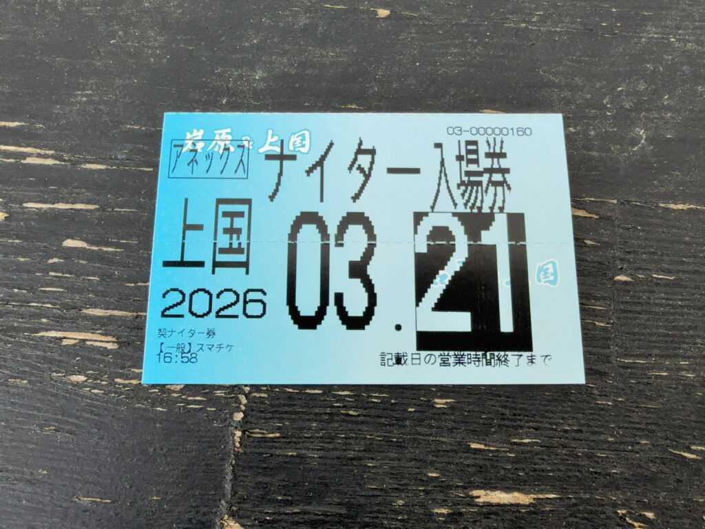 上越国際スキー場のチケットはWebサイトで事前購入できます。ナイター券は別に割引になっていたりしないのですが、財布を出さずに済むだけでも助かるのでWebで事前購入して窓口に向かいました。支払いはクレジットカードとPaypayに対応。今回はPCで購入してみたのですが、Paypay支払い時、画面に表示されたQRコードをスキャンする方式は初めて使いました。これ他のQR決済でも対応してほしいですね。