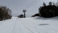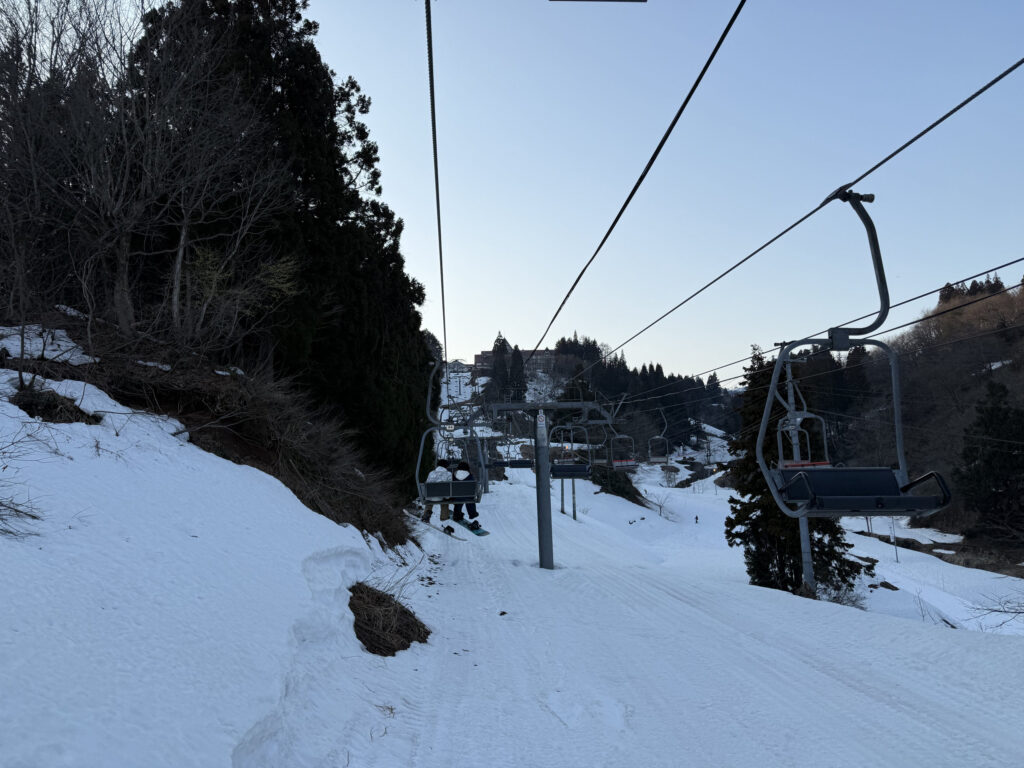早速リフトに乗ってホテル前まで登ります。リフト下の積雪状況など見ると、さすがに解けて減っていますが、ひどい状況というわけでも無さそうな印象でした。