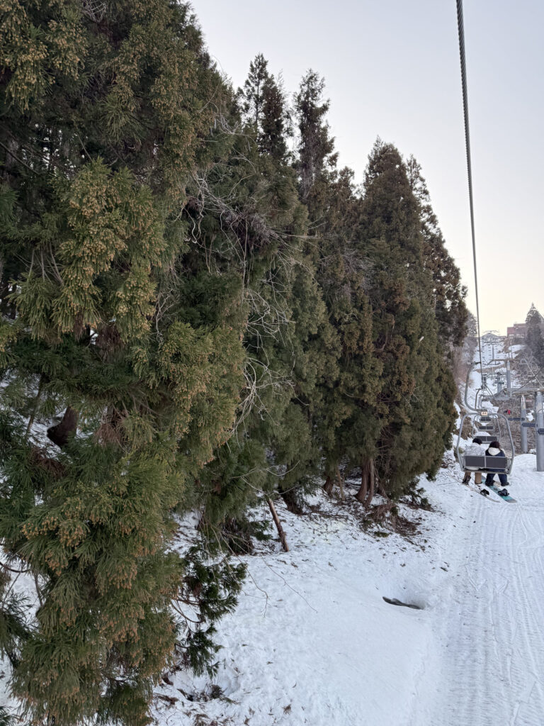それより花粉が酷かったです。鼻水が止まらないタイミングがあって苦労しました。リフト脇に黄色く色づいた杉の枝が迫っておりビビりました。