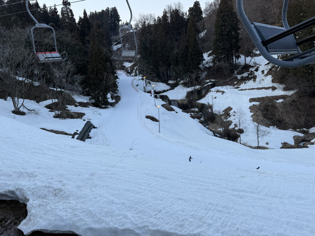 リフトから下山コースが見えましたが、結構しっかり雪が残っていたのが印象的でした。これならしばらくアネックスまで滑って帰れそうで良かったです。