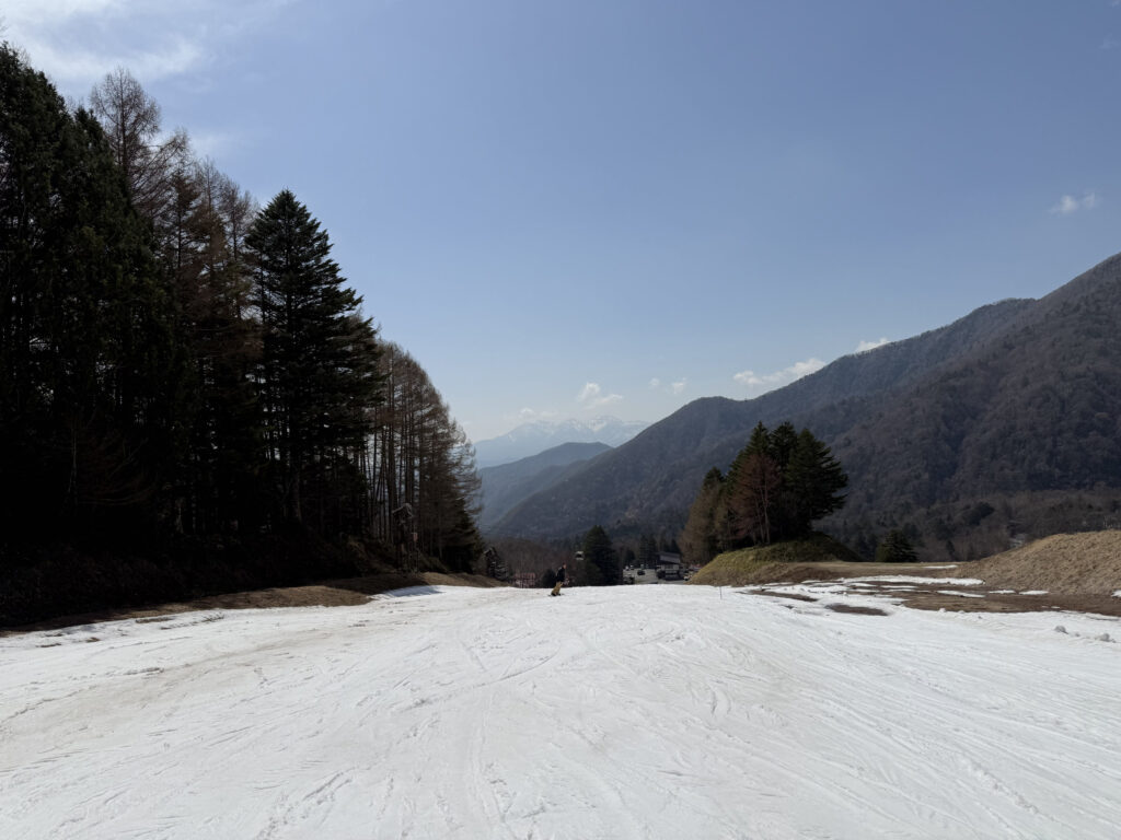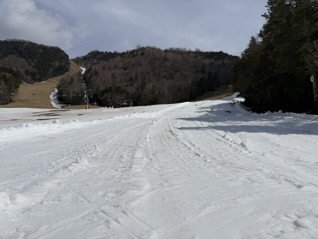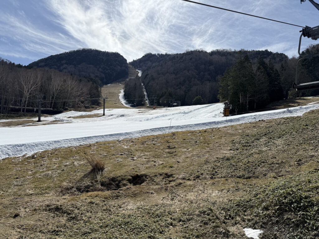 結論からいうと、ゲレンデには意外に雪は残っていて良かったです。コバルトコース(というか、第8リフトのところ)を早々にクローズしたのは、ここからバイオレットコースに雪を出して維持するためだったようです。