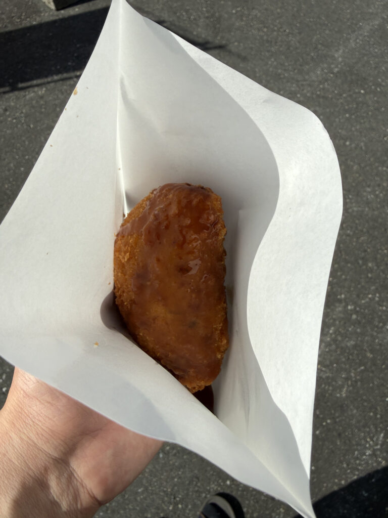 ゆばコロッケとちょっと悩みましたが、今回は餃子コロッケをチョイス。熱々で美味しかったです。