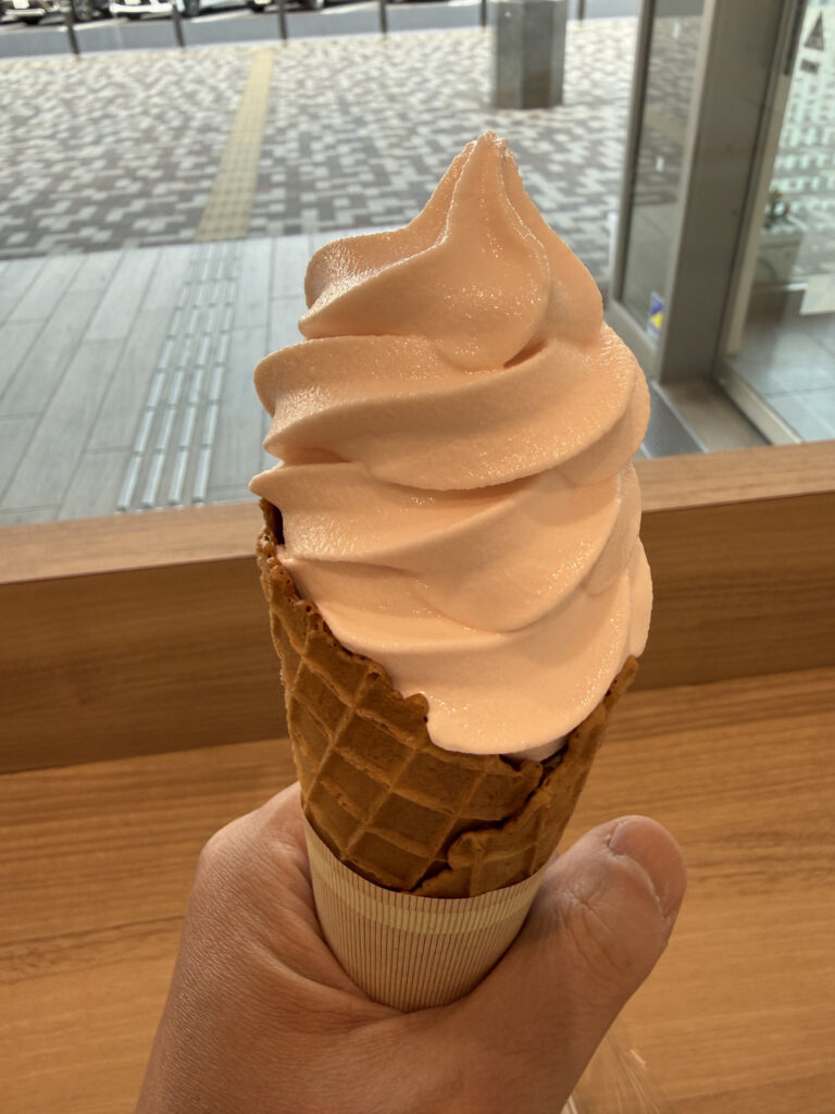 が、下り線側でも売っていたのは「やよいひめ」ソフトクリームだったので、結局これを頂きました。いちごのソフトクリームというより、いちごミルクのソフトクリームという感じで、とても美味しかったです。ベースは変わらず栃木乳業で、「レモン牛乳」ではな「イチゴ牛乳」がベースということらしい。美味しかったのですが、レモン牛乳ソフトクリームはどうなったのか、気になるところです。