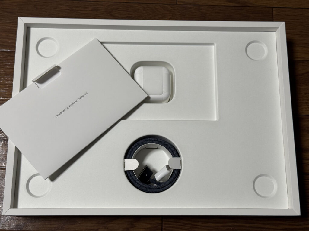 付属品は充電器とMagSafe3の充電ケーブル。USB-C PDで充電できてしまうので、このケーブル使わんのですよね。