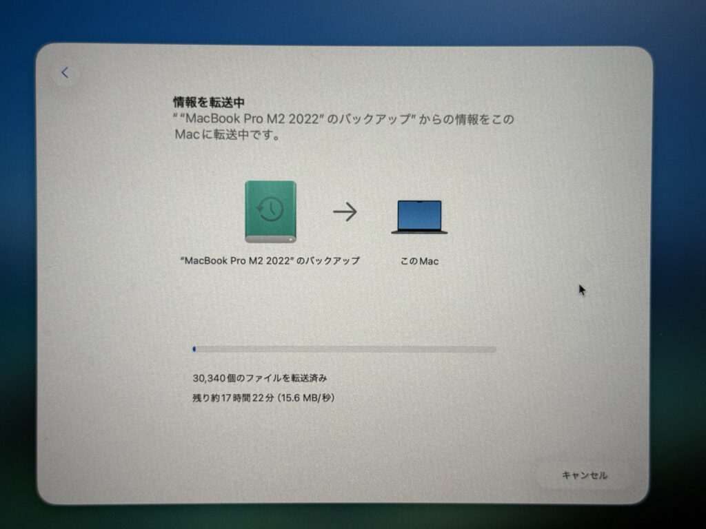 TimeMachineのリストアは楽で良いのですが、容量が大きいとそれなりに時間がかかります。